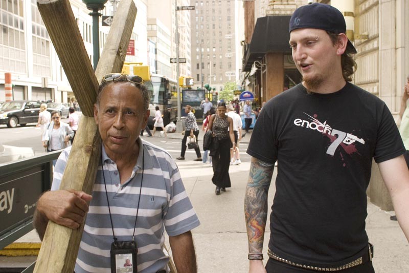 A stranger helps Nate carry the cross in Lower Manhattan