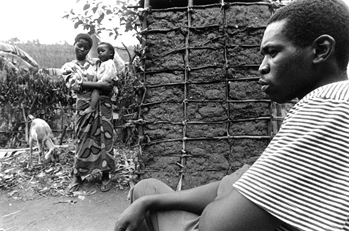 Francois Minani, the first juvenile to be convicted of Genocide since the second world war in front of his family's home in Rwanda. He now lives in his childhood home with his wife and son.